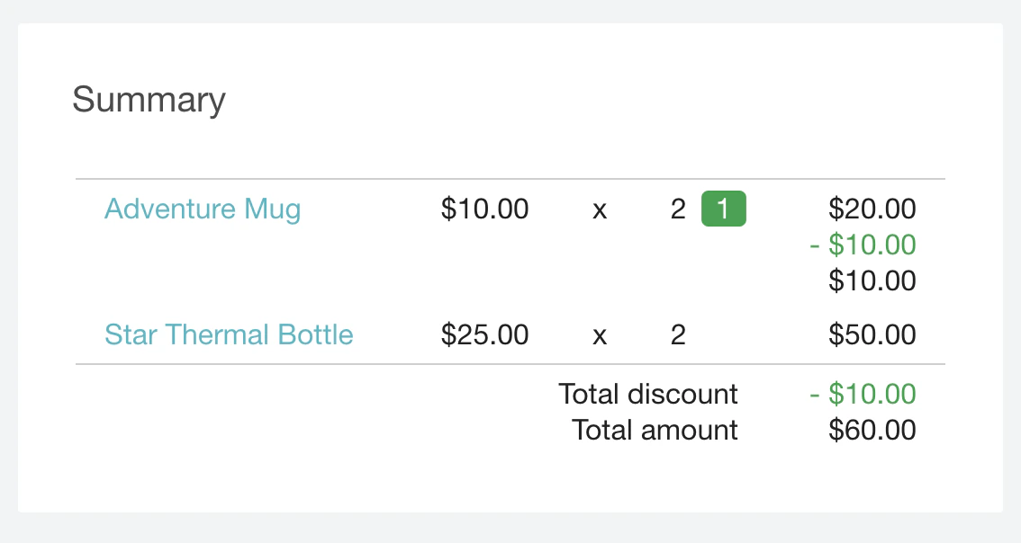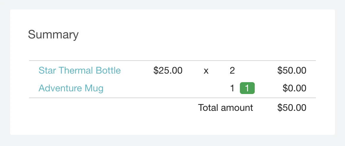In this example, the cart includes an Adventure mug and one mug is added for free. A Star thermal bottle is added as a reference item that is not covered by any discount. Check the request tab for reference.