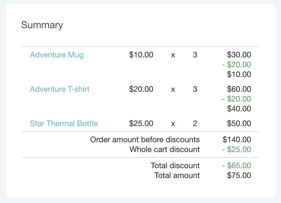 In the case of discounts, the end-customer can be shown the data as indicated in the code. This example covers any redeemed discount applied to the end-customer, whether it is applied from a discount coupon, cart promotion, gift card, or pay with points. In this example, two discounts are applied:- a discount that reduces each item subtotal by $20 and covers only the products with