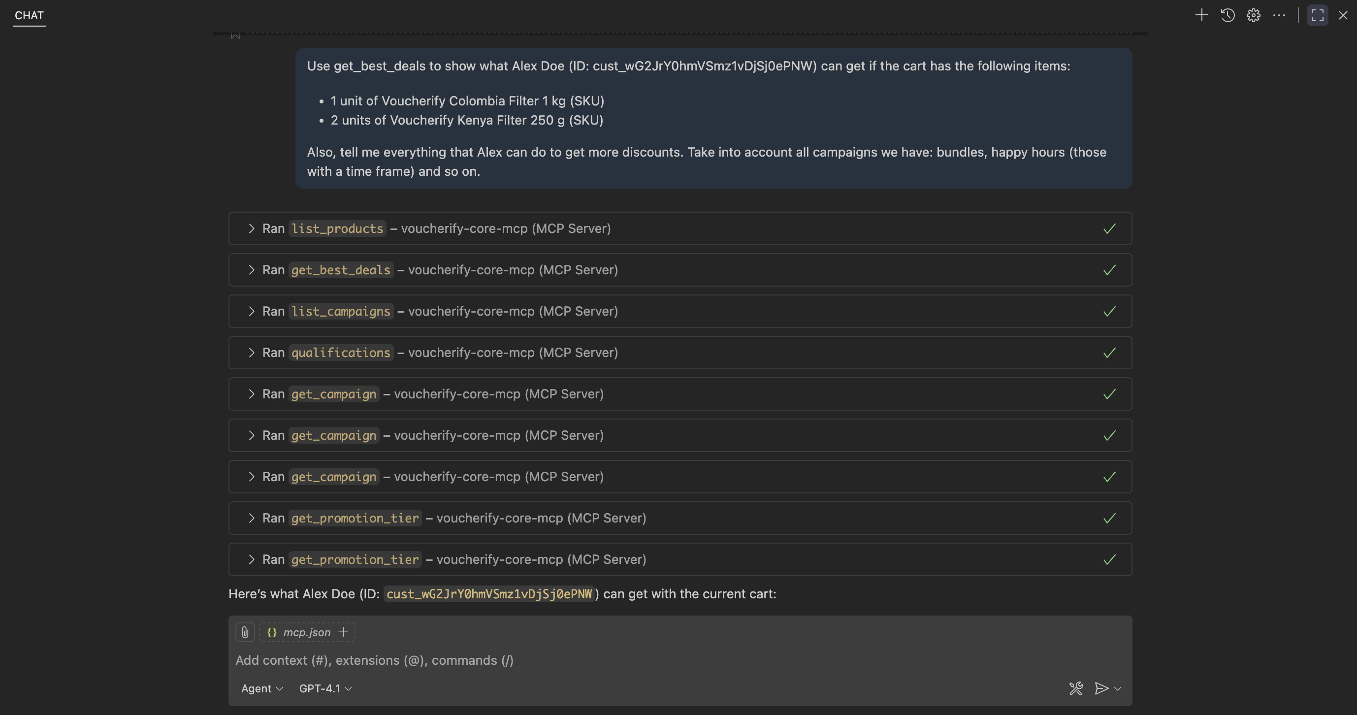 You can interact with the Voucherify MCP using natural language in your AI agents, just as you would with other AI tools.Get best deals for a given customer