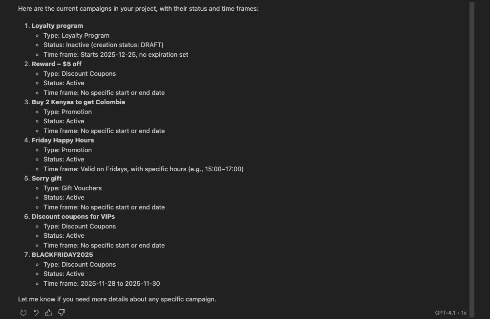 In this scenario, the user wants to learn what Voucherify campaigns there are in the project and if they’re active, have time frames set, and similar details. . This gives a quick overview of needed info about campaigns.